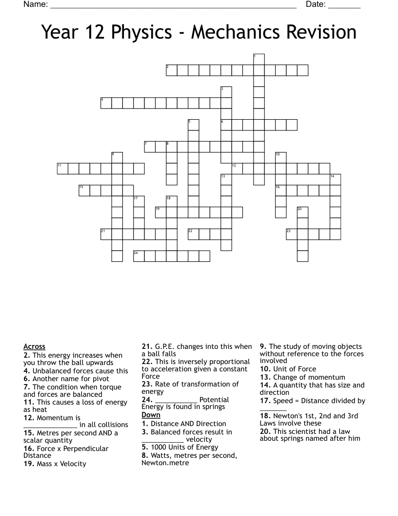 Year 12 Physics Mechanics Revision Crossword WordMint